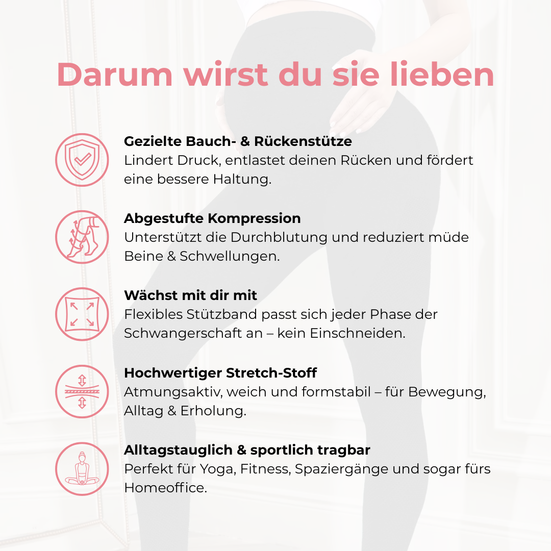 Mit wachsendem Bauch leidet häufig auch die Körperhaltung – und genau hier setzt die MomFlex Leggings an. Der speziell designte, dehnbare Stützbund entlastet deinen Rücken sanft, verteilt das Gewicht deines Bauchs optimal und hilft dabei, die Belastung zu reduzieren. So beugst du Rückenschmerzen vor und kannst dich wieder freier bewegen – ob beim Yoga, beim Spaziergang oder im Alltag zu Hause.